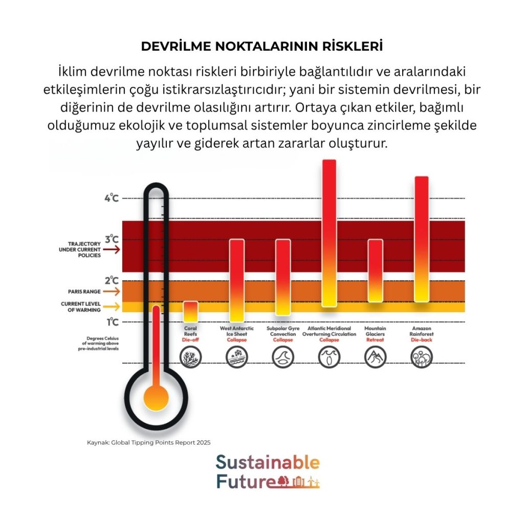 İklim biliminde “devrilme noktası” (tipping point), doğal bir sistemde küçük bir ek baskının, sistemi ani ve çoğu zaman geri döndürülmesi güç bir eşiğin ötesine itmesi anlamına geliyor. Küresel ısınmanın 1,5°C sınırını aşması, milyarlarca insanı etkileyebilecek bir tehlike bölgesine doğru ilerlediğimizi gösteriyor; çünkü her bir ek ısınma kesri, yeni ve daha yıkıcı devrilme noktalarını tetikleme olasılığını artırıyor. Bu eşiklerin aşılması, gıda güvenliğinden enerji altyapısına, ekonomik istikrardan toplumsal uyuma kadar dokuz kritik alanda derin riskler yaratma potansiyeline sahiptir.