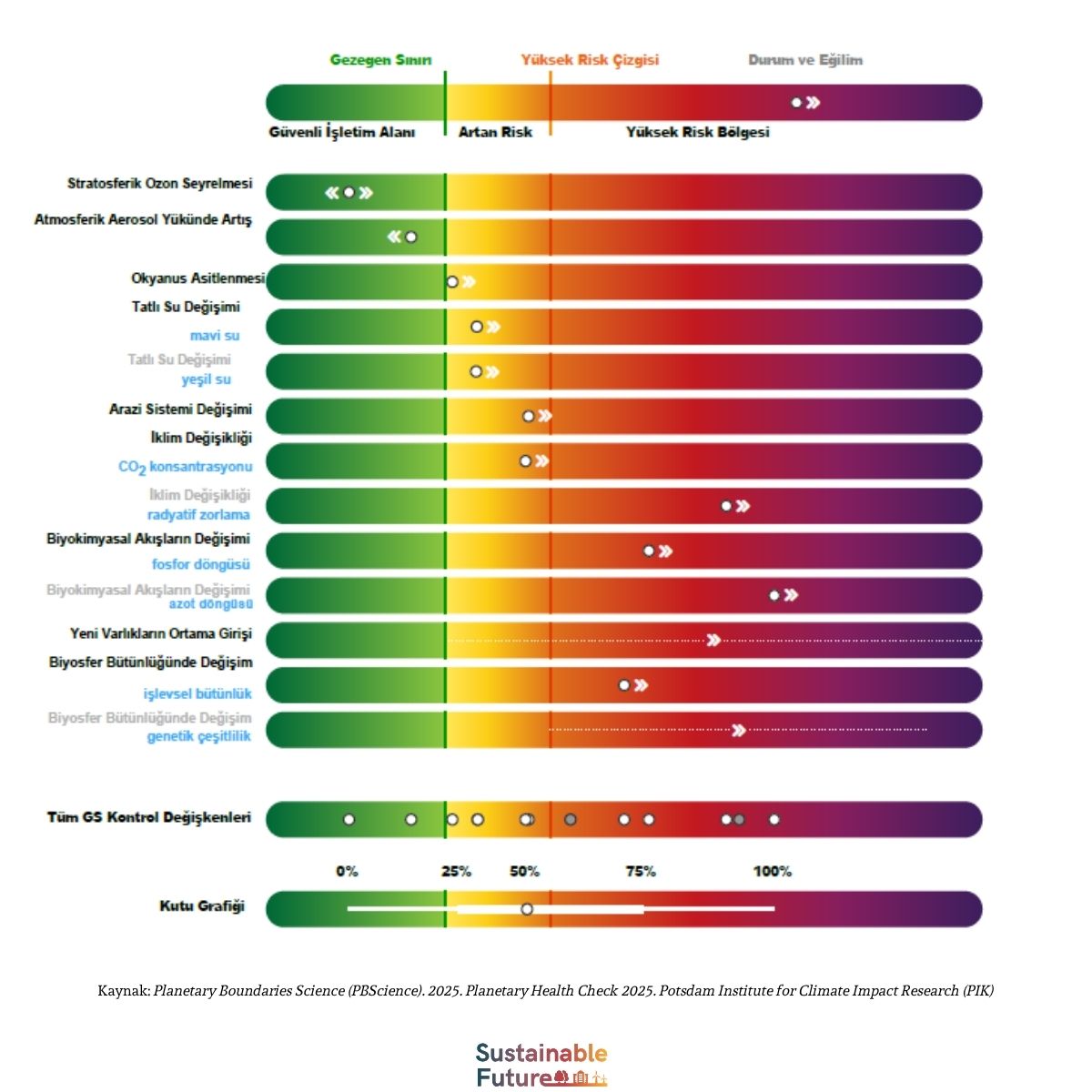 Potsdam İklim Etkisi Araştırma Enstitüsü tarafından hazırlanan Gezegensel Sağlık Kontrolü 2025 raporu yayımlandı. Gezegenin Durumuna İlişkin Bilimsel Değerlendirme ’ye göre 9 Gezegensel Sınır incelenmiştir.