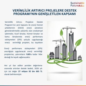 Yeni kapsam ile enerji hizmet şirketlerinin (ESCO) enerji yöneticisi görevlendirmekle yükümlü olan endüstriyel işletmeler, ticarî binalar, hizmet binaları ve kamu binalarında enerji performans sözleşmeleri (EPS) yoluyla uygulayacağı enerji verimliliği projeleri, bu teşvikten yararlanabileceği belirtilmiştir.